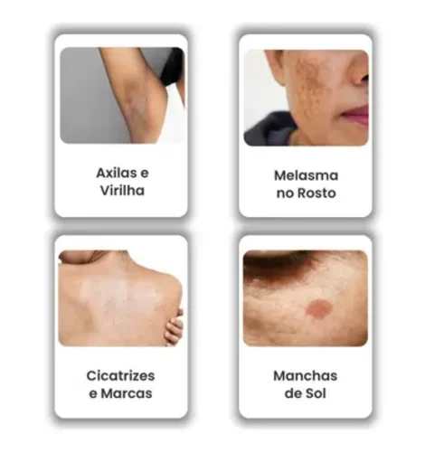Benefícios: Clareia manchas escuras, Melasma e marcas de acne. Uniformiza o tom da pele, suaviza linhas de expressão e deixa a pele mais iluminada e hidratada.